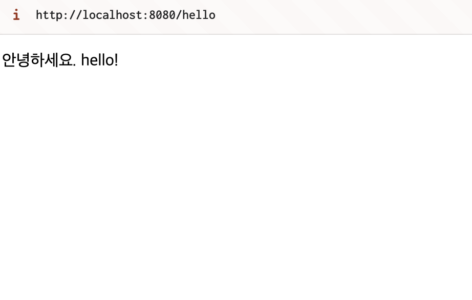 model에 hello!라는 데이터를 만들고 templates의 hello.html을 실행하도록 반환값을 설정해주었다.