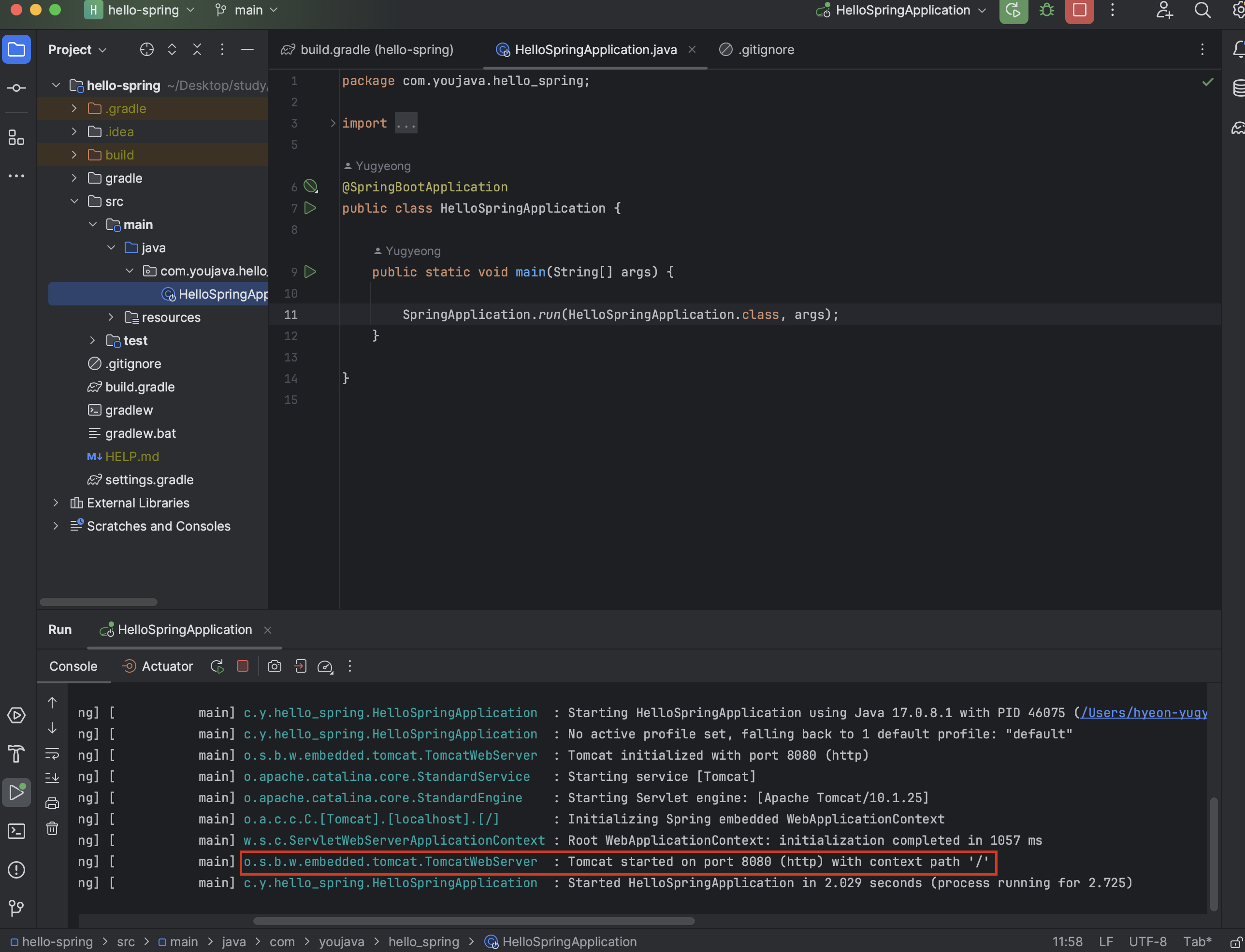 HelloSpringApplication.java를 실행시켜 보면 아래의 그림과 같이 Tomcat started on port 8080 문구를 볼 수 있다.