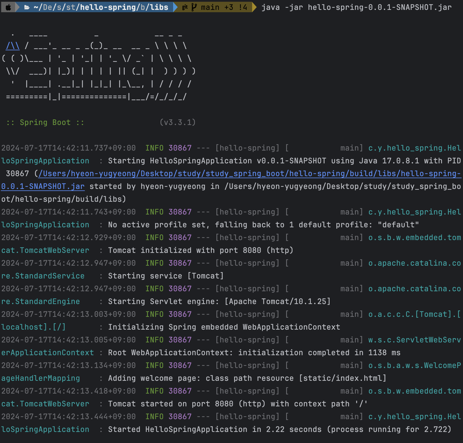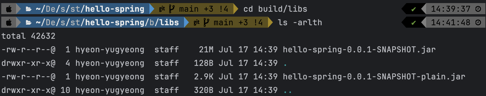 ./gradlew build 시 hello-spring-0.0.1-SNAPSHOT.jar와 hello-spring-0.0.1-SNAPSHOT-plain.jar이 생기는 것을 확인할 수 있다.