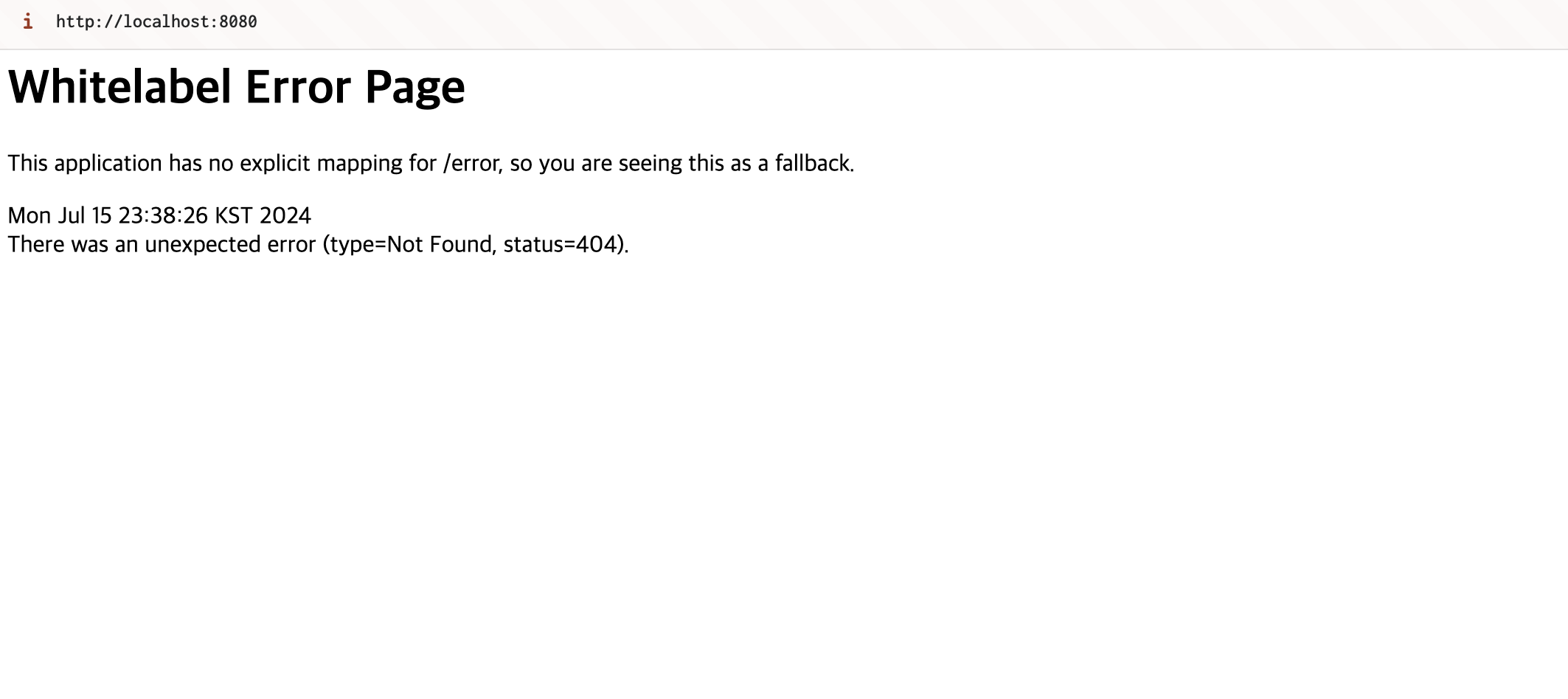localhost:8080을 실행해 보면 아래와 같은 페이지를 볼 수 있는데 아직 코드를 작성해 놓은 것이 없어 error가 뜨는 것이다.