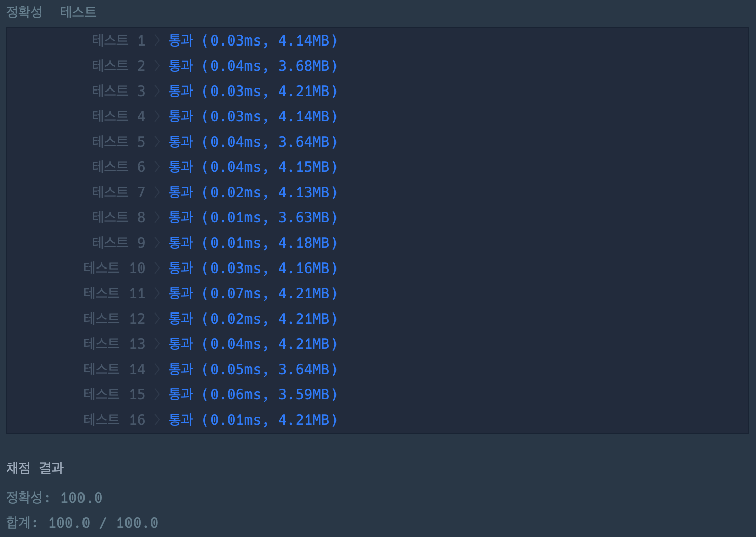 위에서 정리한 내용대로 코드를 작성하니 테스트 케이스를 모두 통과할 수 있었다.
