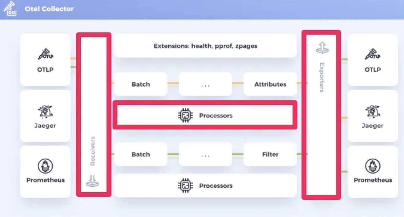 메트릭, 추적, 로그를 수신, 처리 후에 오텔 백엔드로 데이터를 내보내는 방법을 제공한다. OTel의 구성은 Receivers, processors, exporters 세 가지로 구성된다.