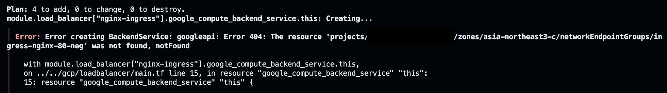 Error: Error creating BackendService: googleapi: Error 404: The resource 'projects/project_id/zones/asia-northeast3-c/networkEndpointGroups/ingress-nginx-80-neg' was not found, notFound 우선 에러 메시지를 통해 Network Endpoint Group(NEG)가 존재하지 않거나 아직 생성되지 않아 발생한 에러라는 점을 캐치했다. 에러 메시지에서 알려준 ../../gcp/loadbalancer/main.tf의 15번째 줄을 따라가 보니 ingress와 loadbalancer를 설정하는 과정에서 발생한 문제라는 것을 알 수 있었습니다.