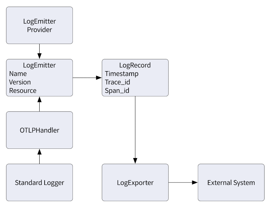 위의 그림은 하나 이상의 로그 이미터를 인스턴스화하는 매커니즘을 제공하는 LogEmitterProvider, LogRecord 데이터를 생성하는 LogEmitter, 로그 레코드를 사용하고 데이터를 백엔드로 보내는 LogExporter가 있다.