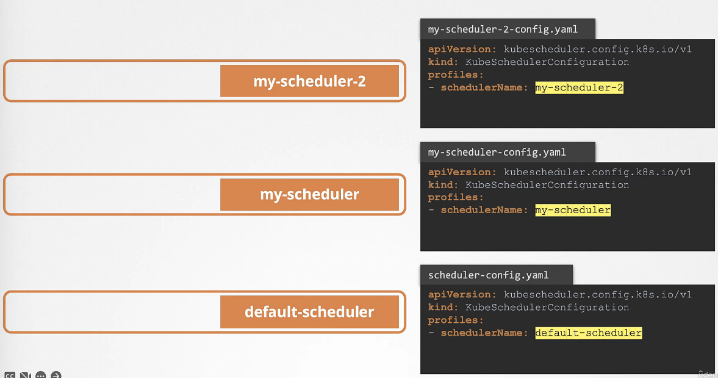 쿠버네티스 클러스터는 한 번에 여러 스케줄러를 가질 수 있는데, 파드를 만들거나 배치할 때 쿠버네티스에게 특정 스케줄러가 파드를 지정하도록 지시할 수 있다. 스케줄러가 여러 개일 경우 반드시 고유한 이름을 가져야 하고, 스케줄러 config yaml을 사용해 각 스케줄러의 이름을 설정할 수 있다. 이때 이름을 지정하지 않으면 스케줄러의 이름은 default-scheduler가 된다.