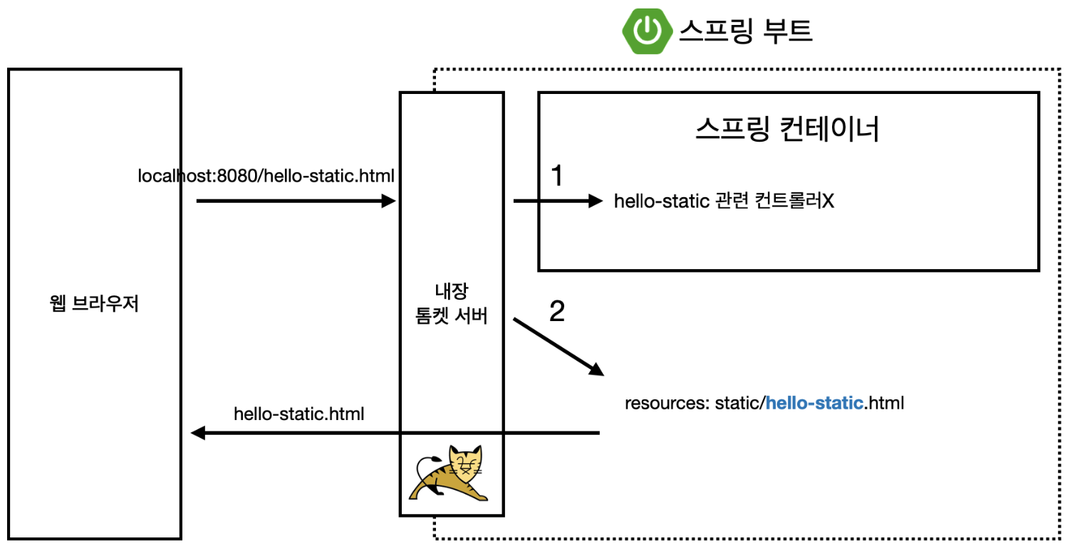 스프링 웹은 정적 컨텐츠, MVC와 템플릿 엔진, API를 기본으로 개발된다. 각 개념이 무엇인지, 어떻게 개발하는지를 알아보도록 하자. 정적 컨텐츠SpringBoot는 /static 디렉토리나 ServletContext의 루트에서 정적 컨텐츠를 가져와 전달하는 한다. 아래와 같이 static 디렉토리 아래 hello-static.html을 작성하고 localhost:8080/[파일명]으로 접근하면 정적 컨텐츠를 확인할 수 있다. 아래는 정적 컨텐츠가 사용자에게 나타나는 과정을 나타낸다.웹 브라우저에서 hello-static.html를 찾으면내장 톰켓 서버가 스프링에 전달한다.스프링은 hello-static 관련 컨트롤러를 먼저 찾는다. (controller의 우선순위가 resources보다 높다는 걸..